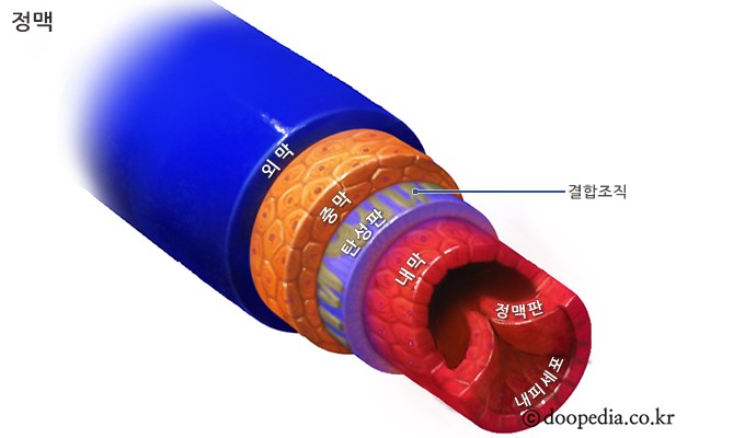 동맥의 벽은 내막 · 중막 · 외막의 세 층으로 되어 있습니다. 내막은 내피세포(內皮細胞)와 이것을 덮고 있는 탄력성 섬유로 되었고, 중막은 탄력성 섬유와 고리 모양의 민무늬근으로 되어 있습니다. 외막은 주로 혈관과 주위의 조직을 연결하는 결합조직으로 되어 있습니다.